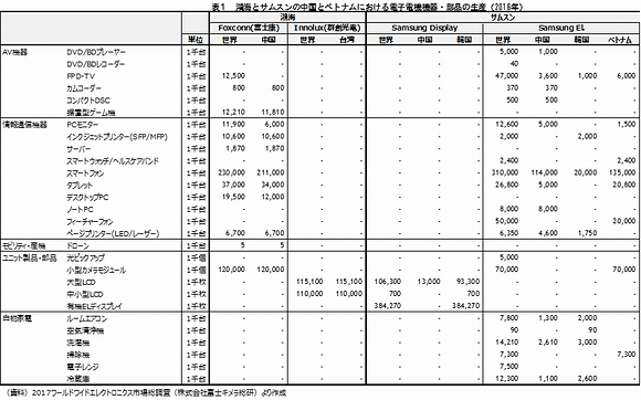 サムスンが脱中国を鮮明にしているのに対して、鴻海は主要製品のほとんどを中国生産に依存している。表1を見る限り、鴻海のベトナムでの生産は皆無に等しい。