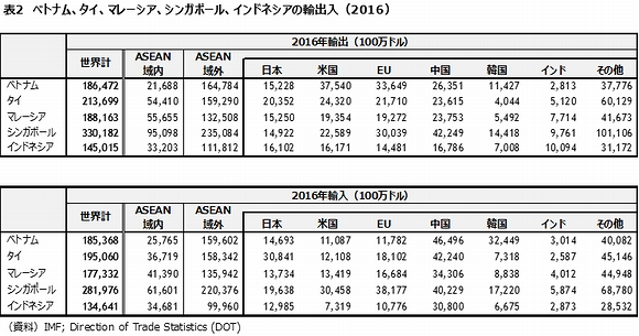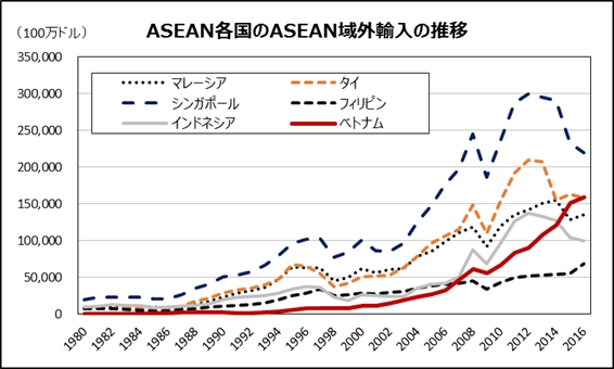 ベトナムのASEAN域外輸出額は、タイを上回り、シンガポールに次いでASEAN第2位に躍進している(図)。ベトナムの輸出は2010年から急拡大し、インドネシア、マレーシア、タイを瞬く間に追い抜いてしまった。米国やEU向け輸出ではASEANの中でタイやシンガポールを引き離してトップに立っている。ベトナムの輸入では、韓国からの輸入が急拡大しており、日本を大きく上回り、中国に迫る勢いである。ベトナムの貿易収支の赤字幅は、2016年には対中国と対韓国がほぼ同じ規模の赤字に並び、2017年には対韓赤字が対中赤字を上回った。