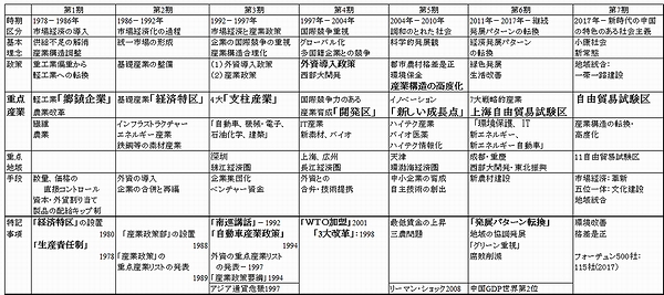 ここで、中国の産業育成政策を表2により説明する(朽木、2007年)。産業育成政策は、改革開放後を時期区分すると大きく7期に分けられる。1978年に改革開放政策が始まり、第1期の市場経済の導入(1978~1986年)、第2期の市場経済の形成(1986~1992年)、第3期の市場経済と産業政策(1992~1997年)、および第4期の国際競争重視(1997~2004年)、第5期の調和のとれた社会(2004~2010年)、第6期の経済発展パターンの転換(2011年~継続)である。第7期が2017年から第6期の継続である。