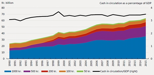 デンマークでは最高額面の1,000クローネが最も多く流通しており,流通額も年々増加している。1,000クローネは2006-11年あたりまで横ばいで推移していたのが2012年以降再び増加に転じている。2012年以降実施されているマイナス金利政策の影響があるかもしれない。 デンマークでは2009-10年にかけて紙幣を切り替えているが,旧紙幣も法定通貨として使うことができる。硬貨はフィンランド造幣局から購入している。補助単位øreでは25øreが2008年に廃止されており,50øreごとに端数を調整するラウンディングが実施されている。