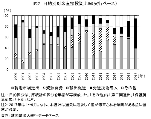 次に、対米直接投資額について目的別に構成比を取ると、一貫して多いのが「現地市場進出」で、常に4割前後を占めている(図2)。それ以外についてみると、2000年代半ばまでは「輸出促進」が比較的多かったが、2008~14年は「資源開発」の割合も高まり、特に国際的な資源価格高騰を受け、2011年に急上昇した。しかし、2015年には資源価格下落を受け「資源開発」の割合は1%未満に低下し、2016年以降は「先進技術導入」の割合が急上昇している。このように、韓国企業の米国進出の目的を対米直接投資額ベースでみると、「現地市場進出」を軸としつつも、それ以外の主要な目的は「輸出促進」→「資源開発」→「先進技術導入」といったように、局面ごとに変化している。 他方、トランプ政権の保護主義政策に対応した投資は同図から見る限りでは限定的といえよう。このことは、後述する対米直接投資事例をみても同様である。サムスン電子やLG電子の米国での洗濯機生産拠点建設のように、すでに通商問題の渦中にある場合には対米直接投資を進めているものの、そうした動きは全体的には未だ大きく顕在化していることはないといえそうである。
