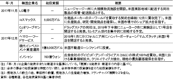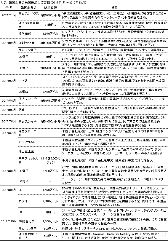 2.最近の主要な対米直接投資事例対外直接投資統計を発表している企画財政部や韓国輸出入銀行では、個別の投資案件について投資企業名を一切公表していない。そこで、韓国の各種メディアや各社発表をベースに、2016~17年の対米直接投資関連の主要事例について、製造業(グリーンフィールド投資、M&A)、非製造業に分けてみることとする(付表)。 製造業のグリーンフィールド投資 - 市場獲得目的が目立つ製造業におけるグリーンフィールド投資では、米国市場の獲得を狙った事例が幅広い分野でみられた。このうち、大型投資の事例としては、ハンコックタイヤのテネシー州でのタイヤ工場建設、クムホタイヤのジョージア州のタイヤ工場建設、サムスン電子のテキサス州オースチンの半導体工場の生産能力増強などが挙げられる。例えば、ハンコックタイヤは8億ドルを投じてテネシー州にタイヤ工場を建設、2017年10月に竣工式を行った。生産能力は当初、年産550万本で、2020年までに1,100万本に拡大する予定である。同社は「2020年にグローバルトップ5入り」を目標として掲げている。それまで韓国、中国、インドネシア、ハンガリーに工場を持っていたが、米国には工場がなかった。世界の自動車メーカーの生産拠点が集積する米国南部地域に工場を建設し、日系を含めた自動車メーカー各社へ拡販し、目標達成を目指す考えである。 なお、トランプ政権の米国製造業振興要請に呼応した対米投資案件に関しては、LG電子が2017年2月に発表したテネシー州の洗濯機工場建設(2億5,000万ドル)が初の大型案件であった。ついで、前述のとおり2017年6月にサムスン電子がサウスカロナイナ州に洗濯機などの家電工場を建設することを発表した(3億8,000万ドル)。両社とも米国のセーフガードの動きに対応し、完工時期を当初の予定より早めたが、このうち、サムスン電子は一足早く2018年1月に工場を完工した。韓国経済新聞(2018年1月15日、電子版)は「サムスン電子は2020年までに生産能力を年間100万台に拡大する計画と発表した。これはサムスン電子が北米市場に輸出する洗濯機の60~70%水準」と紹介している。 ただし、前述のように、現在までのところは、このような動きが幅広く拡大しているようではない模様である。 3.製造業のM&A - 技術獲得目的などを狙う製造業におけるM&Aとしては、まず、米国企業が保有する技術を獲得する狙いのものが目に付いた。その象徴が2016年11月にサムスン電子が発表したハーマンインターナショナル買収で、投資額(80億ドル強)は韓国企業の海外企業M&A案件として過去最高額であった。同社は、将来のコア事業の競争力強化のために新技術を有する海外企業の買収を矢継ぎ早に進めてきたが、その中心が米国企業の買収であった。過去、IoT(インターネット・オブ・シングス)プラットフォーム開発 のスマートシングス買収(2014年8月)、モバイル決裁のループペイ買収(2015年2月)などがあったが、その流れが続いたわけである。ただし、サムスン・グループの事実上のトップである李在鎔サムスン電子副会長が2017年2月に逮捕されて以降、大型M&Aはストップしている。 投資規模は小さいものの、バイオ分野でも技術力獲得を狙った米国企業への出資が散見された。例えば、製薬メーカーの柳韓洋行は2016年4月、米国の合弁会社のパートナーでもある抗体医薬品開発のソレントに1,000万ドルの出資を行っている。 米国市場における流通網確保のために米国企業を買収した事例も散見された。例えば、サムスン電子は2016年8月、家電メーカーのデイコーの買収契約締結を発表した。これは、米国における新築住宅ビルトイン家電事業の強化を狙ったものである。同社は「(デイコーは)北米の住宅・不動産関連市場で高級家電ブランドとしての名声と競争力が認められている」「ラクジュアリー・パッケージのラインアップの拡大と専門流通網の確保などで事業基盤を強化する計画」(2016年8月11日)と発表している。 4.非製造業 - 投資収益獲得目的が目立つ非製造業でもさまざまな分野・目的の直接投資事例がみられるが、まず目につくのは、未来アセット資産運用や現代インベストメント運用といった資産運用会社が投資収益獲得目的で米国の不動産・ホテルなどへ積極的に投資していることである。例えば、未来アセット資産運用は2016年5~6月にハワイのホテル取得やアマゾン本社社屋の一部取得が報じられるなど、米国の不動産・ホテルに積極的に投資している。 ついで、米国の消費市場を狙った進出事例もみられた。例えば、ヘマロー・フードサービスは2018年1月、ハンバーガーチェーン「マムズタッチ」米国1号店をカリフォルニア州に開店した。同社は海外事業拡大に注力しており、米国は台湾、ベトナムに次ぐ3番目の海外進出先になる。ソースを米国風にアレンジするなど、現地化に努め、当初の直営店から、将来はフランチャイズ展開を計画している。 さらに、米国市場での販売ネットワークを確保するためのM&Aもみられ