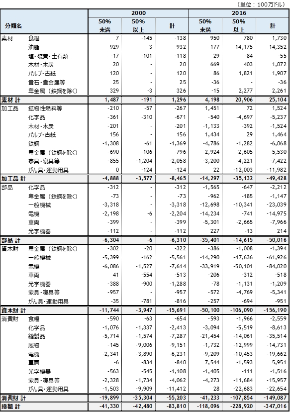 表1 米国の対中貿易収支(貿易依存度別財・業種別、2000年、2016年)