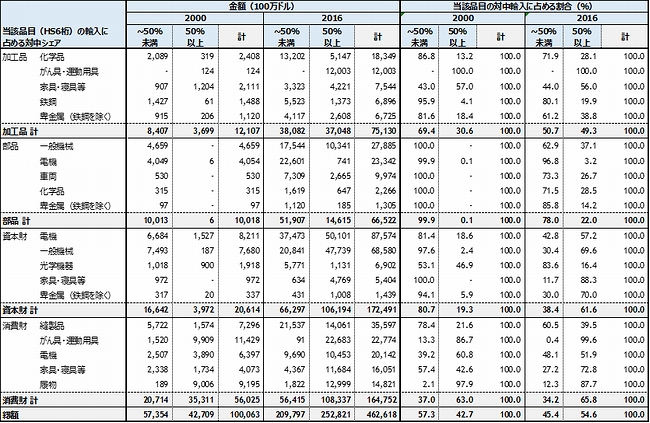 表2 米国の対中輸入(輸入依存度別財・業種別、2000年、2016年)