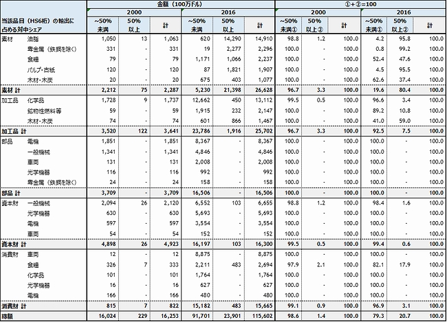 表3 米国の対中輸出(輸出依存度別財・業種別、2000年、2016年)