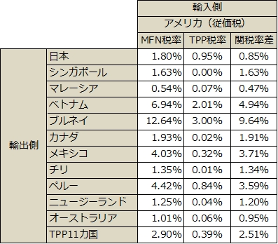 表1:米国のTPP11ヵ国からの輸入の平均関税率(発効から1年目、加重平均)