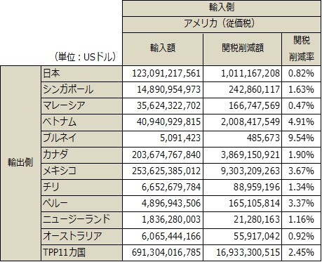 表2:米国のTPP11ヵ国からの輸入の関税削減額及び関税削減率(発効から1年目、加重平均)
