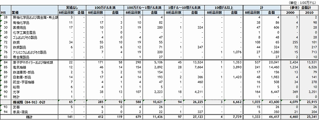第2に、対象品目の輸入金額は、一般機械の200億ドル、電機の144億ドル、光学機器64億ドル、自動車・部品が19億ドルと機械産業が上位を占め、機械産業を合計すると436億ドル、輸入金額では9割超が機械産業の品目が占めている。