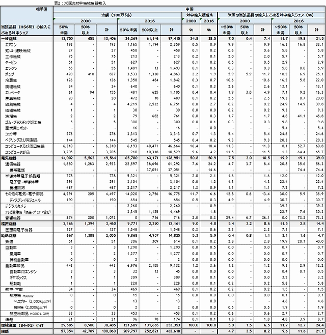 米国の対中機械機器輸入額は、2000年の384億ドルから2016年には2,533億ドル億ドルへと拡大している(表2)。米国の対中機械機器輸入額で最大の品目は、コンピュータ・周辺機器の571億ドル、通信機器の612億ドルで米国の対中機械機器輸入額の46.8%を占めており、中国の対米機械機器輸出額ではこの2業種への依存度が大きい。しかし、対中機械機器輸入で、輸入額はこの2業種ほどではないが、米国の当該輸入額に占める対中輸入の比率が拡大している品目が多く出てきている。エアコン、ポンプ、冷蔵庫、調理機械、エレベーター、農業機械、印刷機械、繊維機械、鉄道、自動車部品などの品目は、2016年には、米国の当該輸入額に占める対中輸入の比率が10%を超えている。2000年には1%以下のシェアであった品目で、中国の対米輸出の次の製品といえよう。
