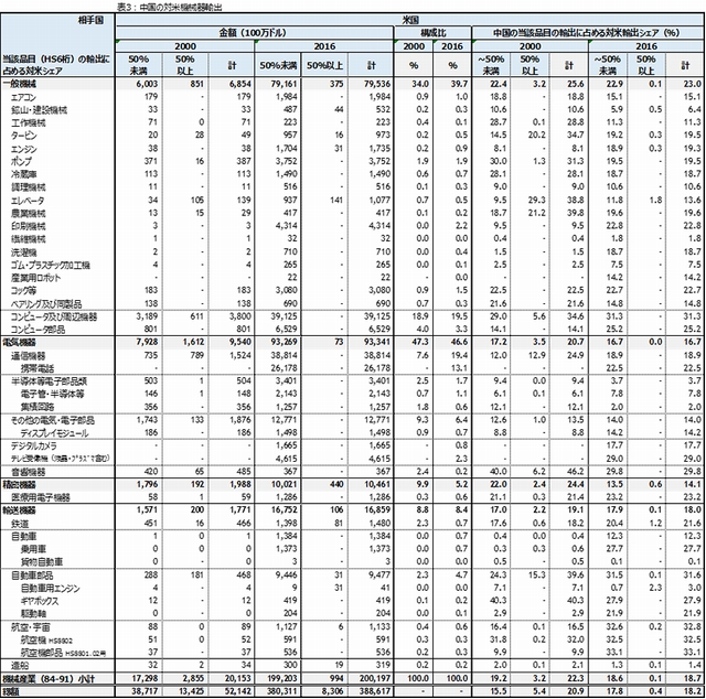 他方、中国の対米機械機器輸出は、2000年の201億ドルから2016年には2,001億ドルへと10倍増となっている。米国の対中機械機器輸入金額と齟齬があるのは、中国の香港輸出の中に香港経由の中国製品が含まれているためである。中国の対米機械機器輸出では、コンピュータ・同周辺機器や携帯電話の対米輸出依存度は、コンピュータ・同周辺機器が31.3%、携帯電話(スマホ)が22.5%と米国の対中輸入依存度の同じく60.8%、74.4%と比べて小さい。これらの品目を米国が制限してもその影響は、米国で大きく、中国では小さい。この貿易存度の非対称性は、上述した香港経由の中国製品が米国の輸入データに含まれていることが影響している要因もあるが、中国地場企業の携帯電話が米市場で参入阻止されていることやインドやASEANなどの新興市場向けに拡大していること等がその要因として指摘できる。