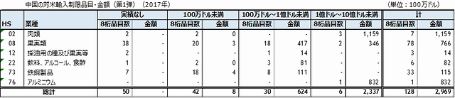 4月1日の第1弾は、米国が通商拡大法232条に基づき、中国産の鉄鋼やアルミニウムの輸入に追加関税を賦課したことへの報復措置である。中国の対米輸入品目、128品目 (HS8桁)に15%から25%の追加関税を賦課する。128品目の対米輸入額は29億ドルである(表1)。