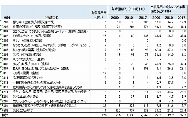 表4中国の対抗措置(米農産物追加関税品目と輸入額)、当該品目の輸入に占める対米シェア