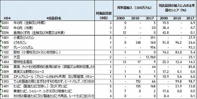 表2中国の対米農産物輸入追加関税品目と輸入額、当該品目の輸入に占める対米シェア