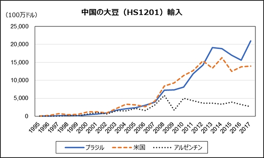 中国の大豆輸入は、2012年以降、米国を抜いてブラジルが最大の輸入先となっている(図1)。2017年はブラジル輸入が急増している。中国メディアによると、3月の大豆の輸入量は米国産が前年同月より3割減った一方、ブラジル産が同3割増えた。中国も米国に対するけん制の手を緩めてはいない。