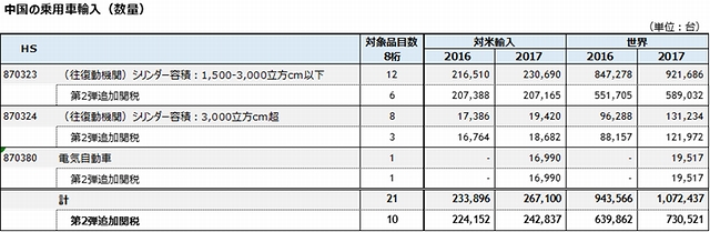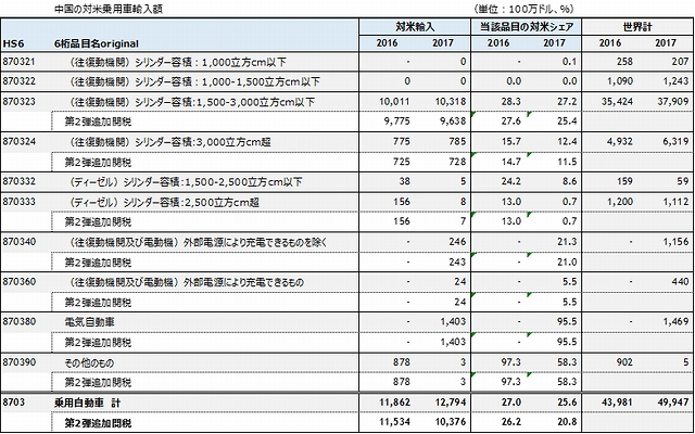このうち、最も影響が大きい車種は、1500㏄から3000㏄の乗用車である。2017年の対米輸入台数は20万台、金額は96億ドルである(表4,5)。中国のこのクラスの乗用車輸入に占める対米輸入シェア(金額)は25.4%を占めている。