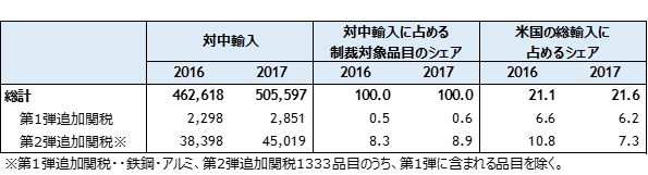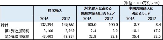 中国政府は、米国の対中輸入追加関税措置に対抗して、2018年4月1日(第1弾)、4月4日(第2弾)に対米輸入追加関税措置(追加関税を賦課する品目リスト)を発表した。WTOの相互主義に基づき、追加関税措置対象品目の輸入額は、米国と同程度の規模となっている。