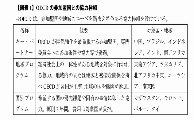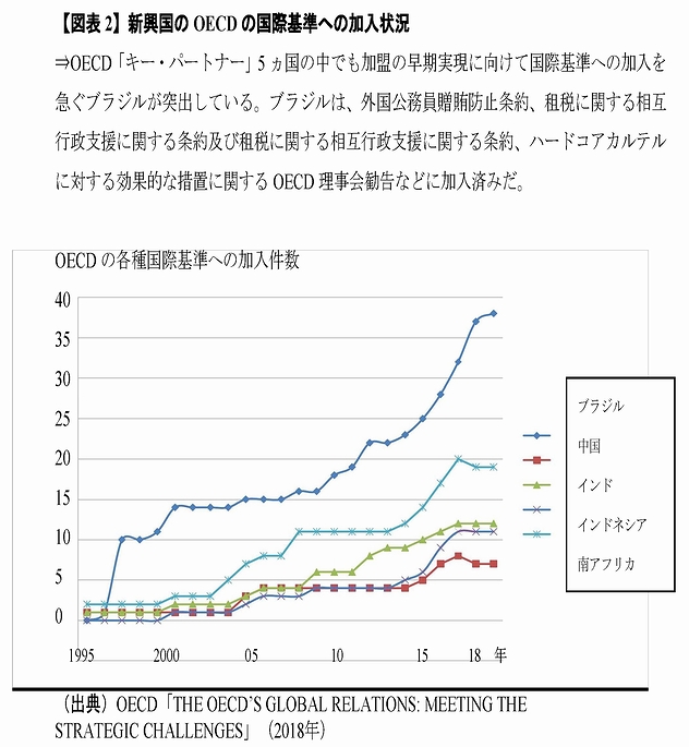 本稿の冒頭、OECDは、目下、グローバル・ガバナンスにおける「有用性」、各国政府への「影響力」、そして意思決定や国際基準の「正統性」を高めるために四輪で疾駆していると形容した。後編では、残りの2つの車輪、すなわち、OECDの加盟拡大と対外関係、そして、内部の組織改革に関する閣僚理事会の成果を説明したい。 3.新規加盟と対外関係の強化(国際ガバナンスにおける位置取り)世界銀行や国際通貨基金が様々な形で新興国の代表性を高めてきたこととの対比で、「中国やインドが参画しない意思決定に何の意味があるのか」という問いは、「先進国クラブ」と揶揄されてきたOECDにとり辛辣かつ深刻だ。一方では自由化水準の高い国際協調の質を落とさず、もう一方で、いかに新興国の利害を取り込みつつ、その適用地域を広げていくか。この二律を追求するOECDの方針は、「質は落とさない。ミニ国連にはならない。普遍的ではないけれどもグローバルな政策ネットワークを目指すのだ」と明快だ。その自画像は、具体的には、①加盟国数は適正規模を保つ、②各種専門委員会の活動には、連携国(アソシエート)など「加盟国未満」のアドホックな資格で参加を開放する(注1)、③国毎や地域別の枠組を設けて協力する(図表1)という輪郭で描かれる。これは、OECDの制度的特徴である参加の開放性と義務の任意性に基づき、以下3つの柱で進められている。 第1の柱は、加盟拡大だ。閣僚理事会には、リトアニアとコロンビアの両大統領が来訪し、加盟文書に署名した。これで合計37か国がメンバーとなった(注2)。加盟審査とは、各種の専門委員会が、加盟申請国の適格を、各々の所掌する国際基準の加入・実施状況に照らして厳格に審査する手続だ。例えば、コロンビアは和平実現よりもOECD加盟の方が困難だった、と皮肉られるように、例えば、労働組合幹部の殺害など政治的・社会的権利の保障への重大な懸念からOECD雇用労働社会委員会の審査は最後まで難航を極めた。 2017年の閣僚理事会は、過去に繰り返された欧州と中南米の安易な「抱き合わせ」ではなく、候補国の力量に応じて秩序立てて加盟させるために、加盟審査に先立つ段階の判断として、ある国に対する審査手続を開始することの当否を決定するための判断枠組を定めた。賑やかにはなったけれども、軽くもなった自身の姿への反省からだ。そこで、OECD理事会は、各々の候補国が、民主主義や市場経済という同質的価値に基づく制度を有するか、OECDの各種基準への加入状況や専門委員会への参加実態、経済規模や生活水準などの基準を当てはめ、全会一致でその適格を判断することと決め、その上で、将来の適正規模を約50か国と見積もった。OECD理事会は、昨年時点で申請していた6か国(アルゼンチン、ブラジル、ペルー、ルーマニア、ブルガリア及びクロアチア)にこの枠組を当てはめ、1年間侃々諤々で議論したが、1年後の閣僚理事会までに結論には至らなかった。これらの6か国は待ちぼうけを食わされた形だ。けれども、メンバーとしてある国を迎え入れるか否かは、すぐれて戦略的な決断であり、二国間関係も加味すれば、全会一致が難しいことは当然である。確かに、ブラジルや本年G20議長国を務めるアルゼンチンが加盟すれば、OECDの周縁化への歯止めと正統性の向上に寄与するだろう。また、GDP第9位の経済大国であるブラジルが、OECD加盟をテコに、自由化と構造改革路線を経済成長パターンに内蔵させる意義は大きい。事実、加盟の早期実現に向けて国際基準への加入を急ぐブラジルの「君子豹変ぶり」は図表2に見て取れる。これが、加盟積極論者が頻繁に論拠として援用するOECD加盟の「改革促進効果」にほかならない。他方、拡大懐疑論者は、加盟する側にとっての意義よりも、これ以上、小さい国を加えることの意義を問う。また、OECDがブラジルを変えることが出来るというのは幻想であり、逆に、ブラジルがOECDを変質させるのが関の山だという。国連やWTOでブラジルの振る舞いに苦汁を嘗めた某加盟国大使の警告だけに重みがある。 対外ガバナンスの第2の柱は、非加盟国への関与だ。ここでは、中国やインドの「キー・パートナー」など様々な協力枠組(図表1)がある中で、特に、日本が重視する「東南アジア地域プログラム」を紹介したい。現在、東南アジアの加盟国はゼロだ。しかし、ASEANのいくつかの国は「中所得国の罠」に危うく足を掛けつつある。成長の配当は十分に行き渡らず、格差も深刻だ。高齢化が始まり、グローバル化やデジタル化の中で高い競争力を維持するのは容易ではない。現代版シルクロード経済圏構想の「一帯一路」を通じ、独自のルールや規格で近隣市場へ浸潤を図る中国の影もちらつく。ASEAN各国の構造改革と地域統合にOECDを活用しない手はない。OECDは、得意とする技術革新や人材育成を通じた生産性の向上、中小企業支援、「質の高いインフラ」の基準作りでASEANと協力を深め、加盟申請にもつなげたい考え