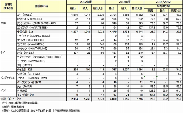 一方、タイとの貿易では、ミャンマーの対タイに占める国境貿易の割合は、2012年で輸出が9.4%、輸入で25.2%、2016年では輸出が14.1%、輸入が53.2%とミャンマーの輸入で国境貿易の比率が高い。