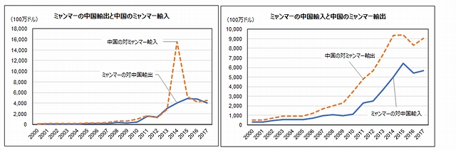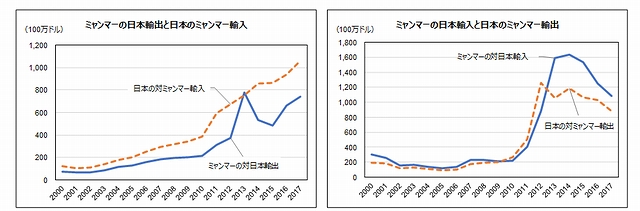 日本の対ミャンマー輸出とミャンマーの対日輸入では2012年から乖離が生じている。これは2012年から生じている現象で、2014,2015年では乖離額は10億ドル以上にも達していた。ミャンマーの対日輸入は、日本の対ミャンマー輸出を2017年で3億ドル上回っている。ただし、乖離幅は縮小傾向にある。日本から輸出している金額以上のものをミャンマーは日本から輸入している。ミャンマーに、周辺国からも日本製品の流入があったものと考えられるが、おそらく、日本の中古自動車の影響と思われる。