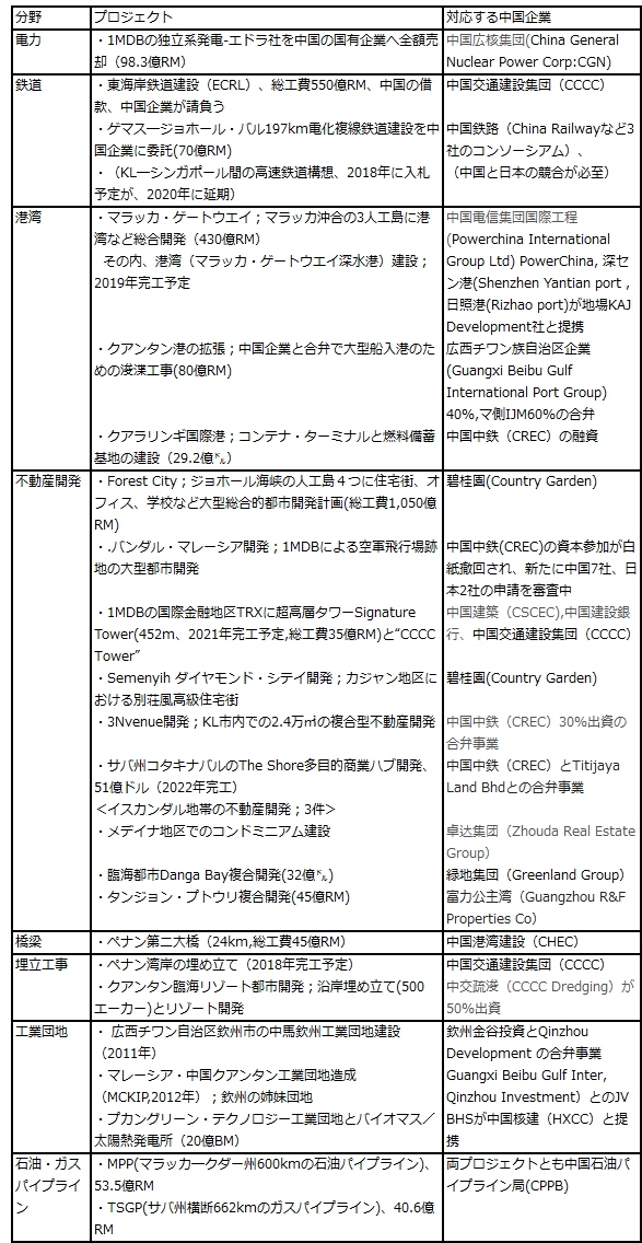 (出所)各種情報から作成(小野沢純「マレーシアにおける「一帯一路」戦略」、『国際貿易と投資』No 110, 2017年12月)