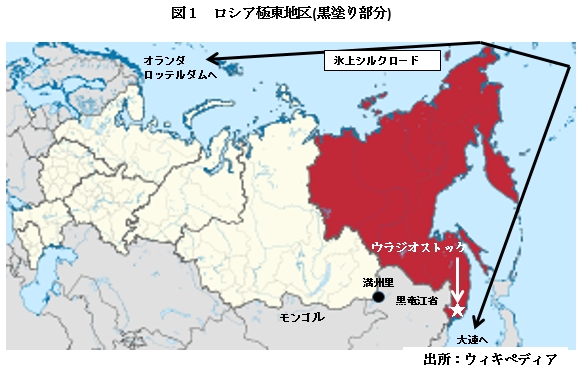 メディアは中国とロシアの蜜月関係を強調中国の各ニュースメディア(注2)は、競って、『フォーラム』特集を掲載し、『フォーラム』の意義や期待などを報じている。そのうち、注目されるのが、各メディアとも、習近平国家主席とプーチン大統領の蜜月ぶりを大きく報じていることである(注3)。中ロ関係(全面戦略協作伙伴関係)は史上最良の関係にあるとの報道は少なくなかったが、今回の首脳会談では、この関係をさらに「攀高峰」(最高レベルに押し上げる)としている。 首脳会談で習近平国家主席が特に強調したのが、①「一帯一路」とロシアが主導する「ユーラシア経済連盟」の発展戦略を連携させ、資源、農業、科学技術のイノベーション、金融などの分野で交流拡大を図ること、②両国は国連常任理事国、新興市場国家として世界平和、繁栄に重責を担っていること、③国連、上海協力機構、BRICSなどと密接に連携しつつ、国連憲章の主旨と原則を擁護し、保護貿易主義に反対し、新型国際関係、人類運命共同体の構築を促進する必要がある、などである。 これに対し、プーチン大統領は、習近平国家主席の『フォーラム』参加を熱烈歓迎するとした上で、両国関係は強靭な発展の威勢にあり、①「ユーラシア経済連盟」の発展戦略と一帯一路の連携協力をさらに推進し、投資、エネルギー、航空、金融、E-コマース等分野での協力を拡大しかつ人的・地方交流を促進すること、②国際実務で協力し、単独主義に反対し、公正で合理的な国際秩序を守り、共同発展・繁栄を実現する、と表明している。 習近平国家主席は、新型国際関係の構築、グローバルガバナンスの改革、そして、人類運命共同体の構築の『3点』を、内外の首脳会談、国際会議の場でことあるごとに強調するが、『フォーラム』では、この『3点セット』につき、ロシアと共同戦線をとっているとの姿勢を前面に推し出したといえよう。「一帯一路」は、この『3点』を実現するための最重要なプラットフォームであり、『フォーラム』の場で、「一帯一路」と「ユーラシア経済連盟」の連携が確認されたことは、「一帯一路」のロシア極東への延伸への布石が打たれたといっても過言ではないであろう。この点、ロシア極東地区と中国東北地区の経済協力が進みつつあり、かつ、中国東北地区が、ロシア国境に接する満州里などを経由した交通運輸ルート(“遼満欧”、“遼蒙欧”、“辽海欧”など)を通じヨーロッパ輸送を強化しようとしていること、さらに、「氷上シルクロード」(図1参照)が始動しつつあることなどから、今後、「東方経済フォーラム」への世界の関心がさらに高まるとみられる。 ところで、「東方経済フォーラム」の『東方』とは、いったいどこを指しているかについては、定義がややあいまいなところがある。習近平国家主席の『フォーラム』開幕式での挨拶では、北東アジア6か国(注4)への言及が少なくないことなどから、本項では、ロシアの極東地区(図1)、中国の東北地区(遼寧省、吉林省、黒竜江省)、モンゴル、日本、韓国、北朝鮮の6国・地区とした。