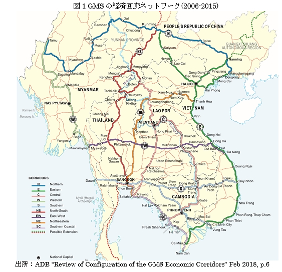 アジア開発銀行(ADB)が構想を主導してきたGMS(大メコン圏)経済回廊は、域内の幹線道路整備が進み、ミャンマーをカバーするルートが増え、呼び名も変更された。2015年までは図1のように9本の経済回廊が特定されていたが、2018年3月のGMSサミットで公表された最新の見直しでは、図2の通り、南北(North-South)、東西(East-West)、南部(Southern)の3系統に再整理されたうえで、それぞれのサブ回廊が増えてネットワークが複雑化している。