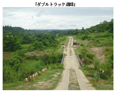 カレーミョへの本線から外れて「ダブルトラック道路」に入ったとのことですが…モンユワから90km強を2時間余り走ったところで、山道を越えて視界が開けてきました。ところが本線から突然右折し、1mほどの幅のコンクリート舗装が2本並行している、これまで見たことのない「ダブルトラック道路」(と命名しておきます)に入りました。二輪車が走るのには問題ないですが、四輪車は舗装を踏み外すと座礁しそうです。幸い我々の運転手は慣れているようで、曲芸のようなハンドルさばきで、この道路を45~50kmを約70分で走り抜けました。のちほど運転手に確認したのですが、本線をそのまま走っていたら、もっとひどい悪路になっていたそうです。この「手抜き」舗装道路は安上がりなバイパスということだと思います。 途中、小川を渡す狭い簡易橋(骨組みは鉄鋼だが路面は木材で組んでいる)を渡ります。水牛たちが何度も行く手を立ちはだかり、警笛を鳴らしてどけさせます。道路の険しさに注意を取られることがなければ風光明媚といえるルートですが、ここをコンテナトレーラーが通るのはとても無理だと思いました。マンダレーからカレーミョへ向かうのに起伏が少ないルートは、北東に進んでシュウェボーを経由する(図2で本ルートの北側に平行する)ルートなのだと思いますが、これものちほど運転手に確認したところ、かなりの悪路のようです。