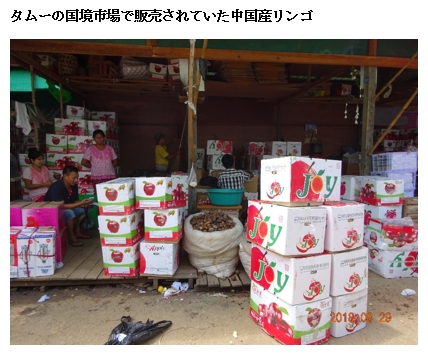 インドの対ミャンマー貿易インドの輸入統計でミャンマーからの輸入品(ミャンマーの対インド輸出品)を見ると、2017年では石鹸やビーフンは見当たらない。石鹸は2010年に僅かな金額が記録されていた。インドの対ミャンマー輸入は、2017年で7.4億ドル、このうち豆類が5.3億ドルと全体の71%を占めている(表1)。次に木材の1.4億ドルである。これで91%を占める。第3番目は、卑金属の2,100万ドル、鉄鋼の1,400万ドルである。ミャンマーの対インド輸出は、豆が主力品で、2017年では、緑豆、き豆(焙煎前のコーヒー豆)の輸出額が大きかった(表2)。 一方、インドの対ミャンマー輸出は、2017年で10億ドル程度、糖類2.2億ドル、医薬品(胃腸薬)1.8億ドル、機械2.4億ドルが主な輸出品である(表3)。 陸路による中国の対インド輸出中国からインドに陸路の輸出額は、65億ドルとなっている。海路が509億ドル、空路が106億ドルと海路と空路に頼っている。陸路の輸出品は、電話機部品(29億ドル)、携帯電話(7億ドル)、ディスプレーモジュール(4億ドル)、リチウムイオン電池(2億ドル)等で電話機部品が半分近くを占めている。これは空路と似ている。 税関区別の陸路輸出額は、黄埔江(29億ドル)、深圳(22億ドル)、広州(8億ドル)、武漢(1.4億ドル)、昆明(1.35億ドル)となっている。上位4か所は中国のIT機器生産地域である。これらの地域からインドに直接トラックで輸送しているケースもあるかもしれないが、香港などのインドとの航空便、船便の利便性が高い地域にトラックで運びそこからインド向けに輸出しているものと推測できる。 陸路を使ってインド市場にアクセスすることが、比較的容易と思われる昆明税関区の対インド輸出額は、2017年で12.7億ドルである。このうち、陸路による輸出は1.35億ドル、空路が11.3億ドルと圧倒的に空路に依存している。輸出品は、電話機部品が8億ドル、携帯電話が1億ドル、デジカメ9,700万ドル、リチウム電池が4,600万ドルと電機が11.5億ドルを占めている。これらは、携帯電話を除いてほぼ空路で輸出している。昆明から陸路で輸出している品目は、携帯電話の1億ドル、PCの1,400万ドル、電話機部品の1,100万ドル、コンピュータの出入力装置、機械部品の5品目である。携帯電話の輸出は2017年から始まっており、ほぼ陸路で輸出されている。それ以前は皆無であった。 他方で、ミャンマー・インド国境のミャンマー側の町タムーの国境市場には、中国製品で溢れている。衣料品や電気・電子製品(見た目は低中級品)、玩具などすべて中国品、加えて中国産のリンゴが大量に売られていた。 中国産リンゴの対インド輸出は、輸送モードでみると、海路による輸出である。中国のリンゴ輸出は、陸路で2017年に6.1億ドル、ベトナムに1.5億ドル、ロシアの9,700万ドルに次いでミャンマーが第3位の9,500万ドル(表5)となっている。昆明税関区からミュンマーに陸路で輸出しているリンゴの数量は7万トン、㎏あたりの単価が1.33ドルである。 タムーの国境市場のリンゴは、ミャンマーに輸出されたリンゴを、ミャンマーの仲買人によってインド人向けに販売しているものであろう。電機用品や衣料品などの中国製品も同様にミャンマーの仲買人が、インド国境まで運んで、インド人を目当てにして販売している小売りに卸しているものと思われる。中国の対ミャンマー輸出には、ミャンマーの仲買人によるインド市場向けの再輸出品が多く含まれているものと推測できよう。