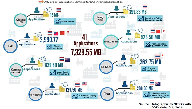 (NESCB、2016年)(注1) これらの地域がSEZとして選ばれた理由は、国境貿易が重要であったからだ。道路網、関税検問所、(タイ・ミャンマーおよびタイ・ラオス)友好橋などインフラ整備がすでに準備済の状況にあったと見られる。図1に示されたとおり、投資が最大のSEZはターク県で、サケーオ県とムクダハーン県がこれに続く。これら3か所のSEZはいずれもタイ~ミャンマーかタイ~ラオスとの国境に隣接する地域である。