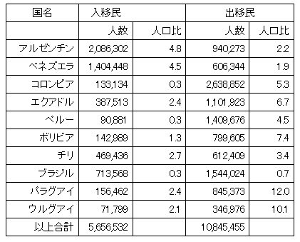 出移民の主な移住先の内訳統計によれば(表2)、最大の移住先は米国(280万人)である。同表の5カ国向け移民合計は、557万人で、出移民総数(表1)1,084.5万人の51%を占めた。南米出身者が移住先として米国等の先進国を目指す動機としては、就労機会や賃金水準が南米に比べて有利なことがあげられる。 一方、南米の入移民総数は約565.7万人で、出移民総数の約半分の規模である。移民受け入れ規模の上位2か国は、アルゼンチン(208.6万人)とベネズエラ(140.4万人)である。 表1の南米10カ国の中で、入移民数が出移民数より多い国はアルゼンチンとベネズエラだけである。表1によれば、入移民数の10カ国合計に対して、アルゼンチンは36.9%、ベネズエラ24.8%のシェアをそれぞれ占めた。これら両国で合わせて南米における入移民の61.7%を受け入れたことになる。