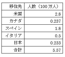 表2 南米出身者の出移民の主な移住先人数 2015年