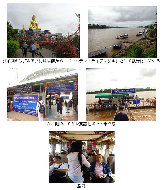 Q.タイ(チェンセン)の出国審査を受けて、中国企業が運営しているスピードボードに乗って、対岸のラオスのイミグレを通過して、金三角SEZに入りました。-タイ側のチェンライ県にあるゴールデントライアングルの観光地ポイントから約1km南にタイ・ラオスの対岸の往来のみを対象とする船着き場へ行くと、前回訪問した5年半前よりもさらに激しく中国人観光客が大勢いた。これからラオス側に渡ろうとする人達と、対岸から戻ってくる人達の両方で賑わっていました。イミグレオフィス(というよりも小屋レベル)はタイのチェンセン地方の管轄ですが、対岸へのスピードボートを運行しているのは対岸のSEZを開発した中国資本でしょう。イミグレの向かいには、5年半前には見なかった中国人観光客向けのレストランほかの商業施設が増えています。 タイ側イミグレの出国のスタンプには「チェンセン」とあるだけで、独自の名前はついていません。ボートは前回、8人乗りほどの小型に乗って無料でしたが、今回は約30人乗りのボートで片道100バーツ料金がかかった。運転手も、着岸・離岸を助けるアシスタントも、中国人です。