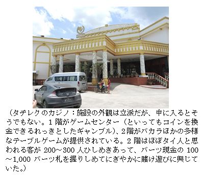 Q. 今回の現地調査では、カジノ訪問は2度目でした。ミャンマーのタチレクが最初。ここはフリーランチ、フリーディナーに、びっくりしました。タイバーツの現ナマが飛び交う、品は良くありませんが、その辺のおじさんやおばさんが、一攫千金を狙って来ているという印象でした。庶民的で活気がありました。ここは、どういう印象を持ちましたか。-こちらのカジノは庶民的とは対照的でした。玄関を入ると、持ち物チェックは厳しいです。カメラはカウンターに預けさせられます。特区の現在の全体像をつかもうと、カジノ内のあちこちのスタッフにいろいろ質問しても、ほとんど無視されました。外国人ジャーナリストなどが取材にきてネガティブな記事を書かれているせいか、ギャンブル客以外の来訪者は歓迎しない方針が徹底している印象です。 カジノの中は午前中のせいか、空いていて、20ほどあるバカラテーブルのうちプレーヤーがいるのは数卓だけ。ディーラーはほとんどが中国人ですが、英語が話せるミャンマー人も少しいるとのことです。使用通貨は人民元。建物の拡張工事やメンテナンスなど肉体労働はミャンマー人を雇っているものと推測します。