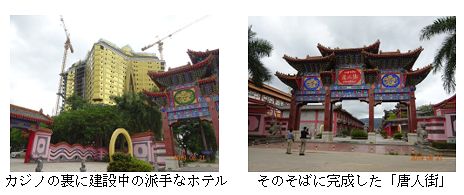 Q、過去2回の視察したときと比べ、特区内の様子にどんな変化がありましたか。-金三角SEZの視察は今回で3回目となります。最初は、7年前にフェイサイから車を借り上げて60km北上しました。2回目は5年半前で、今回と同じようにボートでタイから渡りました。 カジノの北に隣接する低層ホテル,木棉花園酒店Kapok Garden Hotelは、7年前に最初に訪れたときにすでにありましがが、今回はカジノのすぐ裏(東側)に20階建てほどの金ピカ色の、上空から見ると星形をしているような、ド派手なホテルを建設中でした。そのさらに裏には「唐人街」のアーチをもつチャイナタウン(ショッピング街)が建設完了していました。テナント入居はまだこれからというところでした。 カジノを中心に周囲約2km圏内にはすでに中国人住民がしっかり生活圏を築いており、1階が商店や中華料理屋で2階から上が貸し部屋という、中国の都市部で普通に見かけるアパートが林立している様子でした。カジノから天[我鳥]路(Swan Road)というメインストリートを南方向へ3~4km走るあいだには高層のコンドミニアムが続々建設中でした。