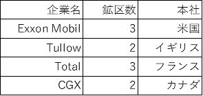 (2) 埋蔵量60億バレルに達したStabroke鉱区 2019年10月末までの報道によれば、ガイアにおける油田発見の具体例としては、次の「Stabrok鉱区」と「Orinduik鉱区」の開発成果が注目される。 ガイアナにおける油田発見の先鞭をつけた企業は、エクソンである。エクソンは1999年に、スターブロック(Stabroek)鉱区の権益を、ガイアナ政府から取得した。同鉱区はガイアナの沖合193キロメートルに、面積2万6,800平方キロメートルを占める。オペレーターのエクソンはその後、2社に権益の一部を転売したことにより、同鉱区の開発は3社が参画している。これら3社の権益配分は、以下のようになっている。 エクソンはガイアナにおける系列企業であるEsso Exploration and Production Guyana Limitedが、45%の権益を持っている。残り30%を米国籍のHess Corp.の系列企業であるHess Guyana Exploration Limittedが、25%をCNOOC Nexen Petroleum Guyana Limittedが保有している。同社はCNOOC(中国海洋石油集団)の系列企業である。 CNOOCのガイアナにおける権益保持企業は、カナダの石油会社NexenをCNOOCが2013年に151億ドルで買収して、発足した。 スターブロック鉱区で、初めて石油の埋蔵が発表された(2015年5月)のは、Liza油田の1号井である。同油田では3号井が2016年10月、原油埋蔵量が10億バレル以上であると発表した。同鉱区における最近の油田発見による累積埋蔵量は、次のように増加している。2018年12月3日付けの10回目の油田発見についてのエクソン発表によれば、同鉱区の可採埋蔵量は、50億バレルに達した。翌2019年4月18日に、同鉱区のTurbot海域で発見した油田によって、埋蔵量は55億バレルに引き上げられた。さらに9月16日に14回目の油田発見(Triple1号油田)が達成され、スターブロック鉱区の埋蔵量は60億バレルに引き上げられた(なお、エクソンの鉱区における埋蔵量は、天然ガスも原油相当量に換算した数値も含んでいる)。 (3) エクソンの生産開始は2020年 エクソンの2025年までの商業ベース生産量目標は(同社の2018年版年次報告による)、75万バレル(日量、以下b/d)である。この内訳として次の各油田の生産量を予定している。Liza油田1号井では、2020年初期に12万b/dで生産開始を予定している。Liza2号井については2022年中頃に2隻目のFPSOを配備して、22万b/dの原油生産を予定している。 同鉱区ではさらにPayara油田で、18万b/dの生産を予定している。また、他の複数油田で合計23万b/dの生産を見込んでいる。 エクソンは海底油田における洋上生産設備として、少なくとも5隻のFPSO(Floating Production,Storge and Offloading System 浮体式海洋石油・ガス生産貯蔵積出設備)を順次、配備することにしている。最初のFPSOはスターブロック鉱区に配備された。同鉱区におけるFPSOの業務は、オランダのSBM Offshore N.V.(以下、SBM)が請け負った。同社所有のFPSO(名称はLiza Destiny)は2019年8月、スターブロック鉱区に到着した。Liza Destinyは韓国の造船所(現代重工業)で1999年に建造された石油タンカー(30万9,300重量トン)であった。SBMはこれを2017年11月、シンガポールのKeppel造船所でFPSOへの改造に着手、2018年6月に完成させた。Liza Destinyの船籍は、韓国で建造された以来のバハマ国を継承している。 Liza DestnyのFPSO業務の能力に関しては原油生産の能力は、22万b/d,随伴ガスの処理能力(日量)は4億立方フィート、水の注入能力25万b/d、原油貯蔵能力160万バレルである。これらの洋上業務に従事する人数は、平均80人を予定している。 SBM(本社所在地:アムステルダム)は従業員数約4,750人、世界各地でFPSO関連事業を展開している。ガイアナではスターブロック鉱区のLiza油田の生産が始まる2020年に、Liza Dinastyの操業開始を皮切りに、FPSOによる生産体制の強化が予想される。 (4)2探査井で油田を発見したOrinduik鉱区 Orinduik鉱区(面積約1,800平方キロメートル)では、2019年に2本の探査井が、2か所の油田を発見した。同鉱区の開発に参加している企業の権益持分は、4社が保有している(表2)。