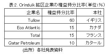 同鉱区のオペレーターは、最大の権益持分を有するTullowである。カタールの国営石油企業であるQatar Petroleum(カタール石油)はTotalから権益持分を取得した。当初、Totalの権益持分は25%であったが、その40%相当分である10%の持分を売却した。また、カタール石油は、Kanuku鉱区でもTotalが保有する25%の持分から10%分を買い取った(両鉱区の持分の変動についての出所は2019年7月29日付けカタール石油発表による)。 Orinduik鉱区で油田を発見した2本の探査井は、Jethro-1号油井(2019年8月12日発表)と、Joe-1号油井(2019年9月16日発表)である。このような探査井の成功例が、今後のOrinduik鉱区の開発への期待を高めている。 発見された油井の資源量については、原油・天然ガスの貯留層の厚さ(単位:メートル)を発表した。Jethro-1号井の厚さは55メートル、Joe-1号井のそれは14メートルである。 同鉱区の推定可採埋蔵量については、3段階の数値(低位値と中位値、高位値)が発表されている。商業生産の目途となる推定可採埋蔵量いついては、3段階の中間値である中位値が採用されている。Orinduik鉱区の推定可採埋蔵量(中位値)は、石油については35億810万バレル、随伴ガスが2兆8,426億立法フィートであると評価した(表3)(注2)。 同鉱区の推定可採埋蔵量を石油と天然ガスの合計埋蔵量を、原油相当量に換算すると39億8,190万バレル(約40億バレル)と評価している(出所は注2参照)。これに前記のスターブロック鉱区の埋蔵量60億バレルを加えると、ガイアナは既に100億バレルの石油資源を保有していることになる。石油大手のBPの統計年刊の統計(2018年末における各国の石油確認埋蔵量)によれば、対象国55か国の中で、100億バレル以上の国数は、16か国である(注3)。但し、ガイアナは同年刊では記載対象国でない。同統計によれば、中南米で100億バレル以上の国は、ベネズエラ(3,033億バレル)とブラジル(134億バレル)の2か国にすぎない。