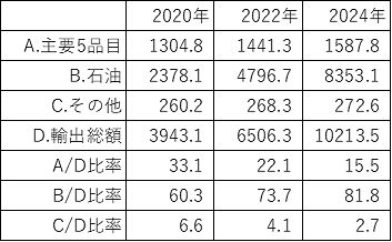 この輸出構造は、2020年から石油輸出が始まると、変化することが予想される(表8)。 同表のIMF予測によれば、2020年に石油輸出が実現すると、輸出総額に占める石油の比率は、60.3%(同表のB/D)に上る。その後も石油が最大の輸出部門の地位を保持することが予想される。