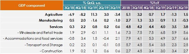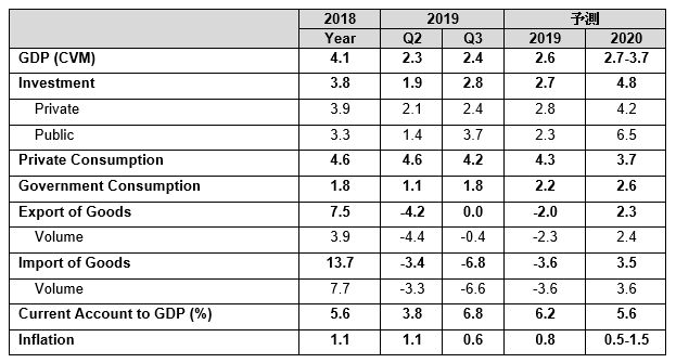 2019年のGDP成長率は、世界的な景気後退(国際通貨基金(IMF)は2019年から2020年度の世界成長の見通しを3.3%~3.6%(対前年比)から2019年は3.0%へ、2020年は3.4%へと下方修正した)や、2018年初頭からの米国と中国間の貿易戦争の影響を受けて、2019年の世界貿易が減速していることから、2018年の4.1%からさらに鈍化し、2015年以来最低となる2.6%の成長率となる見通しである。 タイ政府は、2019年第4四半期における国内民間消費を刺激して同期間の国内の経済成長を高めようと、地方の小売業や近代的な小売業、宿泊施設、食品サービス、不動産など、多くの分野を対象に様々な経済政策を試みたが、部分的な効果が見られたに過ぎなかった。 国家経済社会開発庁(NESDC)は、2020年のタイの景気が2.7%から3.7%の幅で拡大すると予想している。この数値は、(1)民間の消費および投資による内需の継続的な成長機運、(2)政府による景気刺激策、(3)観光業の絶え間ない改善、(4)世界経済と貿易量の緩やかな回復状況による輸出の回復をはじめとする多くの要因から得られたものである。