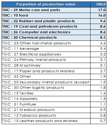 2019年の民間消費支出は、NESDCは、前年度の4.6%(対前年比)に続いて4.3%の成長拡大を予測している。2019年の民間消費支出が引き続き拡大するプラスの要因として、(1)金利およびインフレが前年比で低下、(2)販売業者のプロモーションや電子決済システムの改善によるeコマース支出(オンラインショッピング)の劇的な成長、(3)前年度比較で農業の世帯収入増加、(4)政府による低所得者や低所得農家への支援策、(5)2019年第4四半期、3段階で家計の支出を刺激する「Taste, Shop, Spend(食べる、買い物する、支払う)」と呼ばれる政策等の支援が挙げられる。一方で、2019年の民間消費は(1)世界的な景気減速に加え、米国と中国間の貿易報復による貿易額低下を原因とした輸出部門の生産力削減から、国内の経済活動や雇用が縮小、(2)もち米、天然ゴム、ヤシ油といった農産物価格の変動、(3)国内での洪水や干ばつの発生、(4)特に乗用車など、2018年の耐久消費財への家計支出額の多さなど、多くの課題に直面した。 2020年の民間消費支出は、7%増と見込まれている。2020年の民間消費拡大率が低いのは、主に急速な景気後退を受けてタイ世帯の購買力(需要側)が減速したためである。実際、企業の倒産や失業率が高まるなど各部門にマイナスの影響が出ている。2020年には、1日あたりの最低賃金が全国的に5~6バーツ引き上げられる(2020年1月1日施行)ことで、最低賃金所得層の世帯の購買力が多少高まることとなろう。 タイの産業構造NESDCが算定した2018年のGDPによると、サービス部門と工業部門の付加価値は、それぞれの部門別GDPの61.0%、31.9%を占めている。表4が示すとおり、タイ標準産業分類(TSIC)における産業生産の割合別に記載されたタイの産業構造の現況では、自動車産業の割合が最も高い。これは、1トンピックアップトラックや商業車など、アジアの一大自動車製造拠点としてタイを支えてきた過去の政策によるものである。タイ投資委員会(BOI)によると、政府は、2020年には自動車生産数を350万台に増加させるか、2016年から80%増加させようと見込んでいる。2021年までには、高度技術を導入して地球にやさしい自動車生産拠点にする予定である。また、Sカーブ産業(後述)として自動車産業を推進してきたため、同産業は設備支援や特別な投資政策で強化され、発展している。しかし、2019年度は周辺地域の通貨に比べてバーツが強く、自動車の国内需要が低迷していることから、日本の主要自動車メーカーであるマツダ自動車では、タイでの自動車生産計画と東南アジアにおける自社の自動車製造センターを検討し直している。バーツの度重なる上昇による不利な状況に対応するため、マツダ自動車は2020年に一部モデルの生産を日本に戻す予定である。