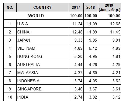 タイの人口構造タイの人口構造は60歳超の高齢者の割合が2000年~2001年に10%を超えて高齢化社会へと転換し始め、2021年には高齢社会となる見込みである。タイは公衆衛生制度の発展によって死亡率が低下し長寿になったことで、周辺諸国よりも早く高齢化社会に突入すると考えられる。さらに、2017年の国連(UN)報告書では、タイの出生率は1.46であった(出生率は、親の世代から置き換わっても国内の人口水準を維持するためには、2.0でなくてはならない)。タイの人口は690万人から2050年には650万人、2100年には約470万人へと減少すると思われる。出生率の低下と高齢者人口の増加によって、近い将来、労働力(15歳から60歳までの年齢層)不足も生じると考えられる。多くの企業が、退職年齢を60歳から65歳に延長したり、外国人労働者を雇い入れたりするなどして、労働力不足の問題を解決すべく取り組んでいる。 タイの輸出2019年、タイからの輸出は、2018年の6.9%(対前年比)から低下して2.0%(同)と見込まれている。この動きは世界の動向と米国、日本、ユーロ圏、中国など主要貿易パートナーの需要によるもので、米国と中国間の貿易紛争のせいで伸び悩んでいることが原因とされている。タイの対米輸出は、2019年1月~9月で、タイの輸出額の12.7%を占め最大の輸出先となった(表5)。この理由としては、中国の景気後退と米国と中国間の貿易紛争によって、特に中国企業を中心に、タイに生産拠点を移していることが挙げられる。 一方で、中国からの世界市場への輸出減少を受け、中国とサプライチェーンで深く連結しているタイでは、中国への輸出が減少した。表6にある通り、タイから中国への輸出品15品目のうち13品目は、原料および中間財であり、対中輸出の少なくとも95%を占める。タイから中国への主な輸出品目は、ゴム、ゴム製品、化学製品の一次製品であるエチレン系ポリマーである。