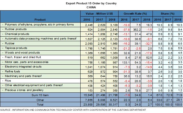 表6 タイの対中国輸出品( 2016年~2018年) ※クリックで拡大します