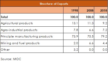 輸出産業とその競争力の推移タイ商務省(MOC)のデータによると、タイの輸出構造はこの20年の間(1998年~2018年)で次のような変化があった(表7)。輸出に占める農産物の割合が、1998年の13.1%から2018年には9.2%へと低下している。一方で、工業製品の割合は1998年の73.9%から2018年には79.2%に上昇した。 20年間(1998年~2018年)における輸出製品の上位10位を詳しく分析すると、次のような変化が見られる(表8)。