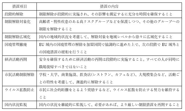 別表1 欧州委員会が推奨する出口戦略の対応措置