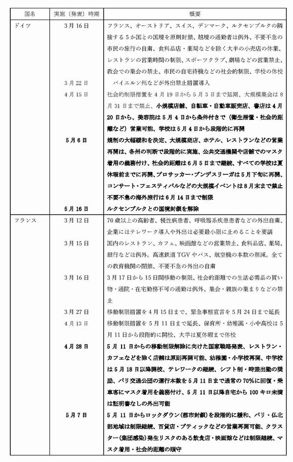 別表2 ドイツ・フランスのコロナ感染拡大防止策と出口戦略(5月16日現在)