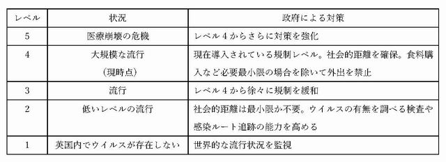 英国、首相コロナ感染、「緩めの規制」で拡大防止策が後手英国では、不幸にしてボリス・ジョンソン首相自ら、新型コロナに感染し、長期の隔離・入院治療を強いられたことで、国家の非常事態時に同氏が強いリーダーシップを発揮できないまま、感染防止の対応が大きく遅れることになった。ジョンソン氏が職務に復帰したのが4月27日であった(首相入院中、ドミニク・ラーブ外相が代行)。すでに、感染者数・死亡者数ともに欧州で最も多く、最悪の状況に陥っていた。 イタリアやスペインで見られたような医療崩壊は何とか回避できたものの、厳しい外出規制や検査増強の遅れが感染拡大につながった面は否めない。3月~4月の感染初期に英政府が「緩めの規制」に時間を費やし、感染防止策が後手に回ったと強い批判を受けていた(注6)。 ジョンソン首相は5月10日、テレビ演説で、3月23日から導入した外出制限を緩和するロードマップを発表した。緩和計画は3段階に分かれている。①社会的距離をとることを条件に、5月11日から建設業と製造業の再開を奨励、5月13日から1日1回運動のための外出回数の制限を解除する(不要不急の外出自粛は継続)、②6月から必需品以外の小売店を段階的に再開する、学校も低学年から順次再開する、③早ければ7月には飲食店・宿泊業などを再開する。同首相は、感染が再拡大した場合には計画通り経済活動を再開させないと述べた(注7)。トヨタは英国バーナストン工場の再稼働を5月25日以降に実施するとしている。 また、「新型コロナ警戒制度」を導入する(表3)。コロナウイルスが国内から消失したレベル1から医療崩壊の危機の最悪レベル5までの5段階に分類し、主として、実行再生産数と新規感染者数をもとに、その時点でのレベルを判別する。ジョンソン氏はこれまでの規制はレベル4(大規模な流行)に該当し、現在はレベル3(流行)への段階的な意向を開始する局面と見ている(注8)。 いずれにしても、感染症防止策が遅れた影響が大きく、ドイツやフランスなどに比べて出口戦略が遅れ気味の計画となっていることは明白である。