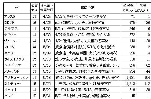 表1 外出禁止令未解除7州と段階的再開州(6月4日現在)