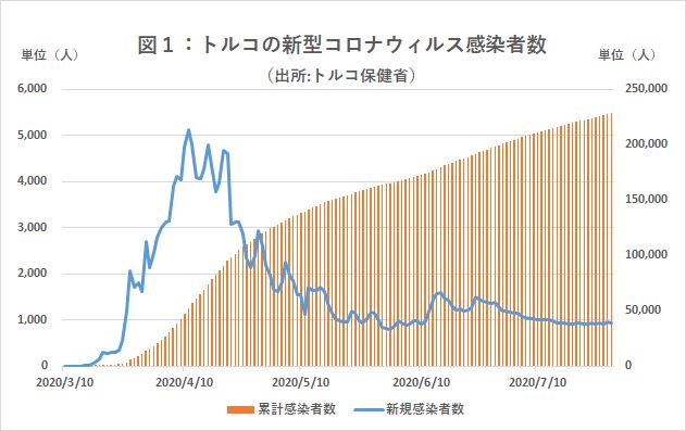 3月に最初の新型コロナウィルスの感染者が確認されて以来、一時期世界で最も速い感染拡大を見せたトルコだが、感染ピークを過ぎ、6月から社会・経済活動を再開した。感染第1波を振り返ると、イタリア、フランス、ドイツなど欧州の感染拡大国と同規模の感染者を出しながら、死者数が極めて少ないことが際立つ。死者数抑制の成功要因は何なのか。公正発展党(AKP)政権の感染症対策の検証とともに探っていきたい。またコロナ禍において、昨年の統一地方選以降静かに進行していた政権支持基盤の弱体化が露呈した。その経緯も併せて示したい。 <6月以降、社会・経済活動を再開>3月10日に国内初の新型コロナウィルスの感染者を確認後、断続的な都市封鎖や外出規制を行ってきたトルコは、6月1日以降、感染防止措置を解除・緩和し、経済活動を再開した。再開の決め手は、5月末に1日当たりの新規感染者数が1,000人を切ったことだったが、6月半ばに再び1,500人台に跳ね上がり、7月半ばまで1,000人台が続いた。その後、新規感染者数は900人台に下がったが、政府は7月31日~8月4日の犠牲祭(クルバン・バイラム)後の再拡大を警戒している。第1波の感染ピークは、新規感染者数5,138人を記録した4月11日だった(注1)(図1)。経済活動再開後は、新たな措置としてマスク着用を全国民に義務化、違反者には罰金を科した。外出禁止令は、高校・大学入試共通試験が行われた6月第3・4週の週末に日中限定で発令されたのみで、政府は社会・経済活動の正常化に後戻りはないことを明確にしている。