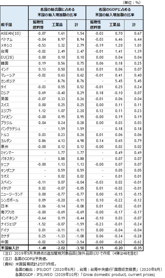 表3 対中輸入関税のインパクト~各国の輸出額・GDPに占める米国の輸入増加額の比率(%)