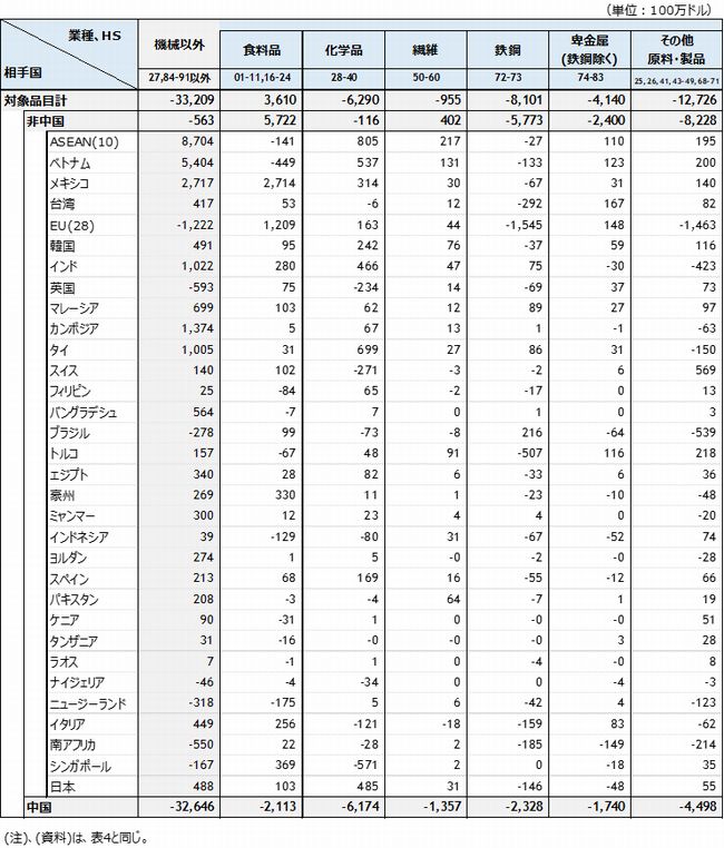 表4 対中追加関税対象品目(非鉱物性燃料)の米国の国地域別輸入増減額(2019-2018年)
