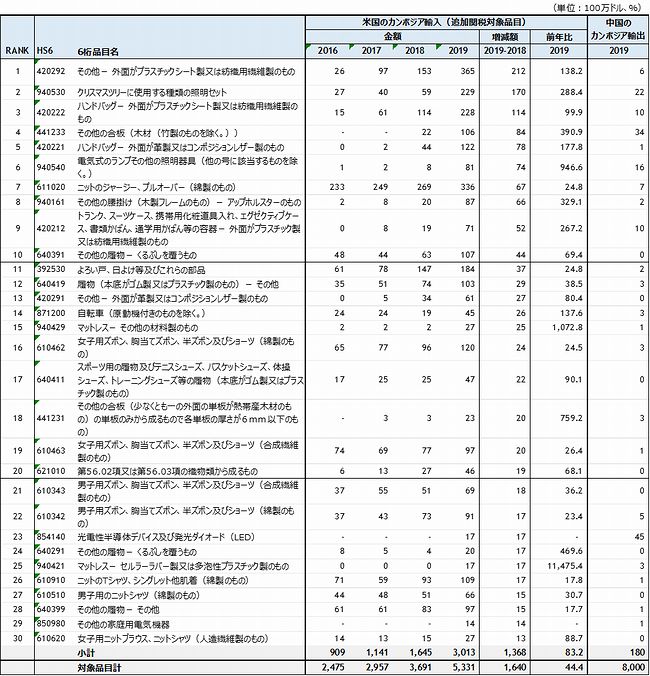 4.短期間に輸出を増す迂回輸出の問題米国の対非中国輸入が、増加した背景には迂回輸出の問題がある。追加関税措置で米国の対非中国輸入は、実態よりも大きい可能性が指摘されている。中国製品の迂回輸出が含まれている可能性があるからである。迂回輸出とは、第3国で短期間に最小限の加工や変更を加えた中国製品について、産地を第3国と表示して米国に再輸出する行為である。例えば、迂回事例として、WSJ紙(「中国鉄鋼の抜け穴、米国は東南アジアに照準」2018 年 4 月 11 日)は、ベトナムの鉄鋼を紹介している。中国国境から約1600キロ南に位置するブンタウという町では、数十の工場が中国から鉄鋼を輸入し、亜鉛めっき加工し、強化した上で輸出するという単純なビジネスが行われていた。ひどい場合は、箱に貼られたラベルだけを変えて、積み替えるだけであるという。米鉄鋼メーカーの製品より安い価格で米国に輸出することも多い。米貿易当局は、タイとマレーシアを含む東南アジア諸国にも照準を合わせている。中国鉄鋼メーカーが貿易の制限を避ける動きに組み込まれているとみている。他の東アジア、東南アジア諸国・地域で、ベトナムほどではないものの対米輸出が増加したのは、台湾、韓国、タイ、マレーシア、フィリピン等で、これらも監視対象のようである。 米国の対カンボジア輸入の急増品目を見ると、迂回輸出の可能性をうかがわせるような動きがある。表6は、対中追加関税対象品目の2019年の米国の対カンボジア輸入増加額上位品目である。及び、中国の対カンボジア輸出額である。米国の対カンボジア輸入では、アパレル製品の輸入増に加えて、2018年では輸入実績が小さかった革製品、バック、スーツケース、合板、照明器具、自転車、マットレスなどの製品が急増している。これらの製品のカンボジア輸出増の裏には、対米輸出リスクを回避する中国企業の動きがあることは容易に想像できる。 ロイターの報道(2019年6月21日)によれば、「米大使館の報道官が、ロイターに電子メールで送った文書で、国土安全保障省がシアヌークビル経済特別区(SSEZ)内の複数の企業を調査し、関税回避のため製品の積み替えを行ったことがわかり、罰金を科したと明らかにした。」一方で、SSEZはウェブサイトに声明を掲載し、内部調査を行った結果、同区で操業する企業のいずれも米国から罰金を科されていないことが判明したと発表した。シアヌークビル経済特別区は、カンボジアの6の経済特区の一つで、中国の民間資本(江蘇省無錫紅豆集団)が開発した工業団地で、160社程度(2020年1月)が操業しているという。 米国は、関税措置の効果減殺する迂回輸出については、厳しく監視するものと思われる。その一つが、原産地規則の厳格化であろう。